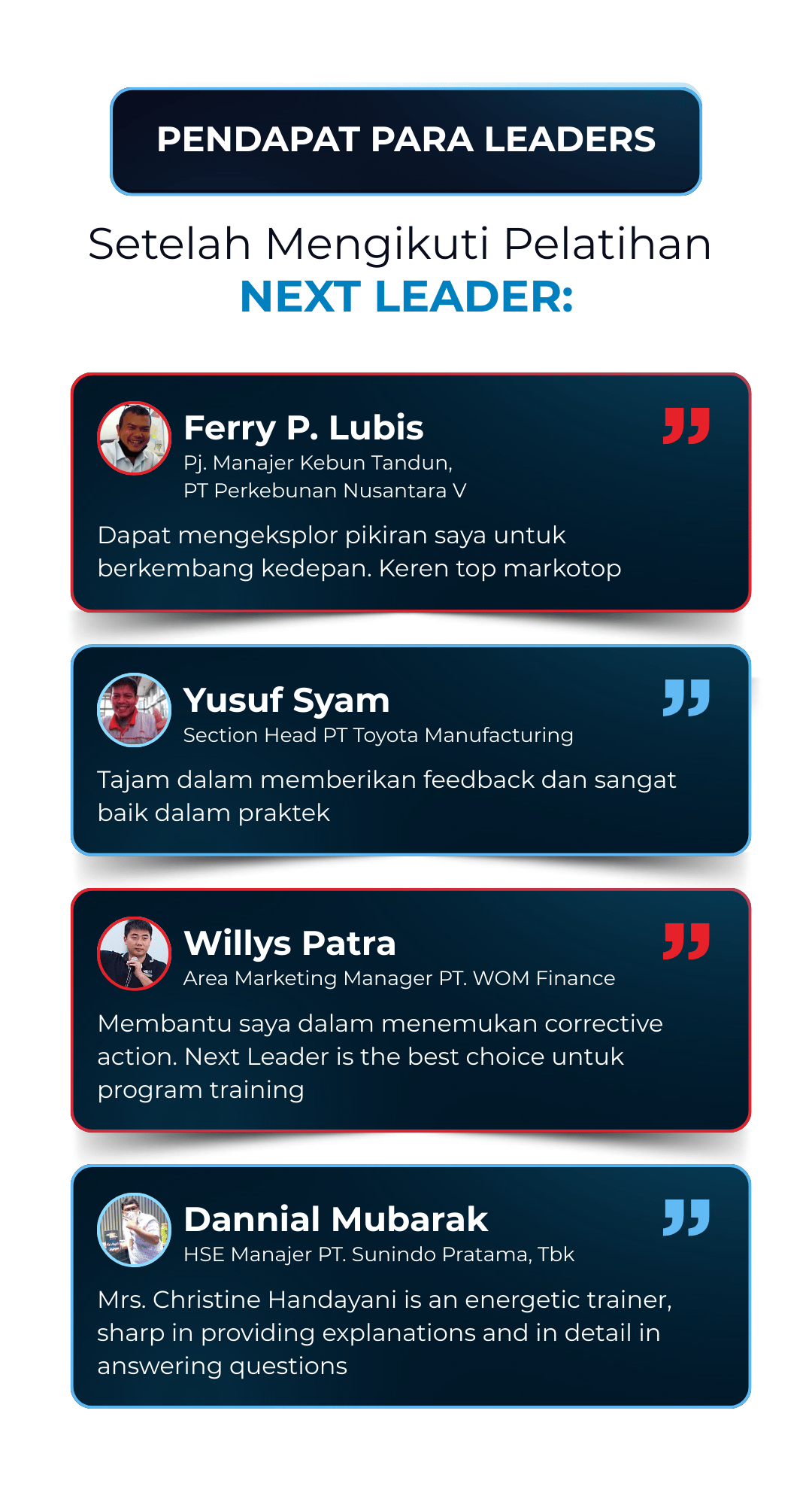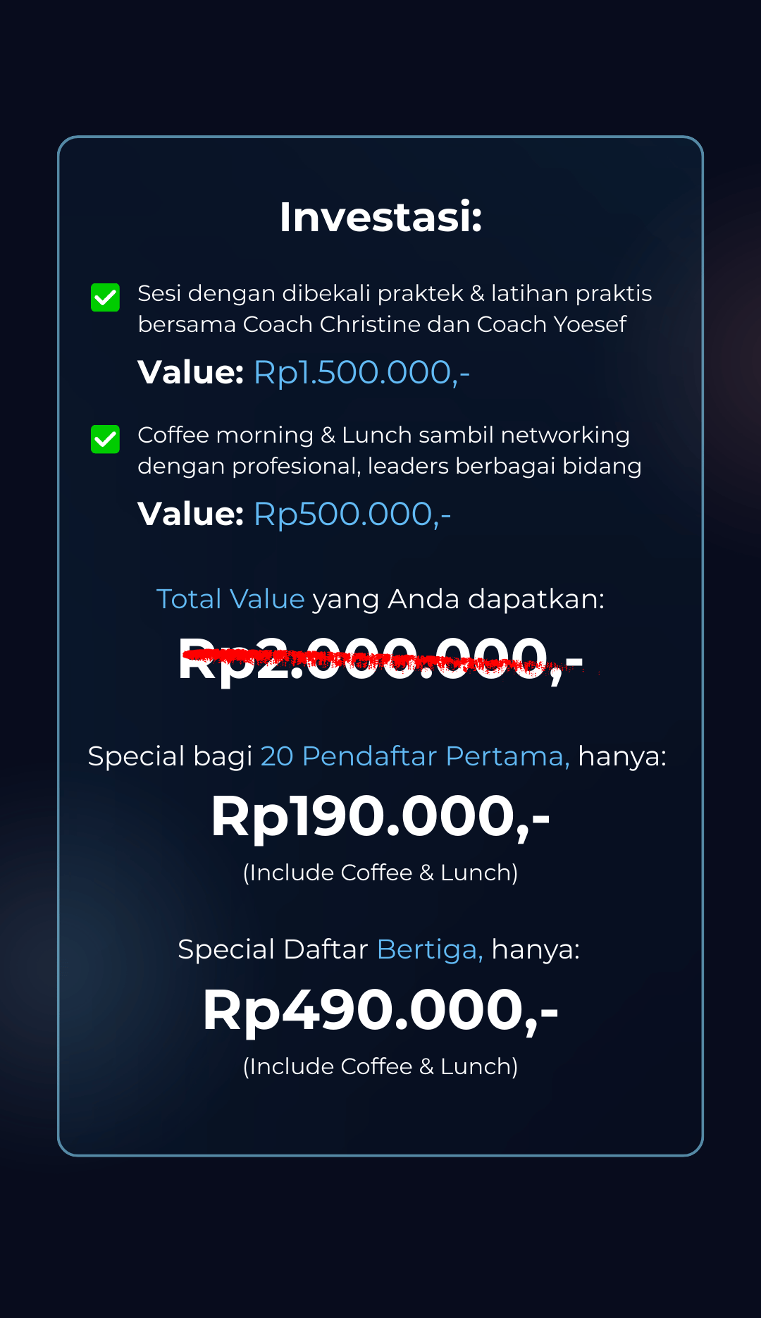 Tentu saja bisa. Sesi ini dirancang secara praktis dan aplikatif yang bisa diikuti semua level di organisasi, pekerja lepas, guru, dosen, wiraswasta dan berbagai profesi lainnya
